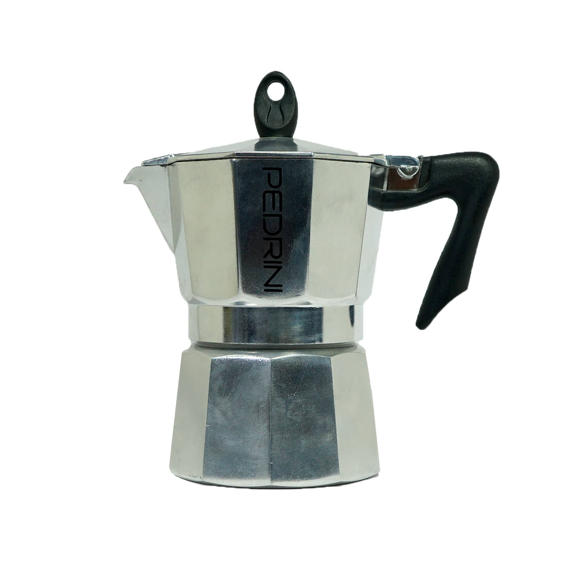 Cafetera moka italiana con capacidad para 3 tazas (160 ml), fabricada en aluminio certificado de calidad alimentaria. Ideal para preparar café espresso con el sabor y aroma de la tradición italiana. Cuenta con mango negro antideslizante resistente hasta 210 °C, válvula de seguridad y silicona duradera apta para alimentos. Su diseño ergonómico y patentado garantiza un uso seguro, cómodo y práctico en la cocina diaria.