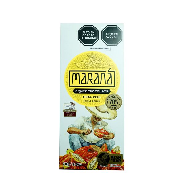 El Chocolate Maraná dark 70% cacao – Piura está elaborado con cacao blanco nativo del norte peruano, cultivado en pequeñas fincas familiares. Destaca por su perfil afrutado, notas cítricas, florales y de frutos secos, que lo convierten en uno de los chocolates más aromáticos de la línea.