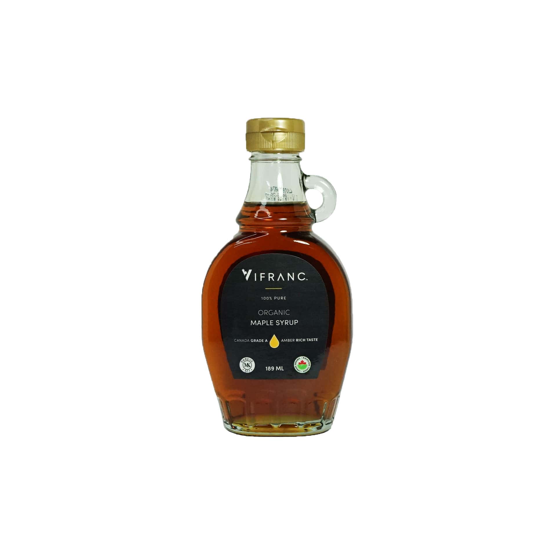 Jarabe de arce 100% puro, obtenido de forma orgánica y sin aditivos. Presenta un sabor ámbar rico, característico del grado A canadiense. Ideal para quienes buscan un endulzante natural y auténtico.