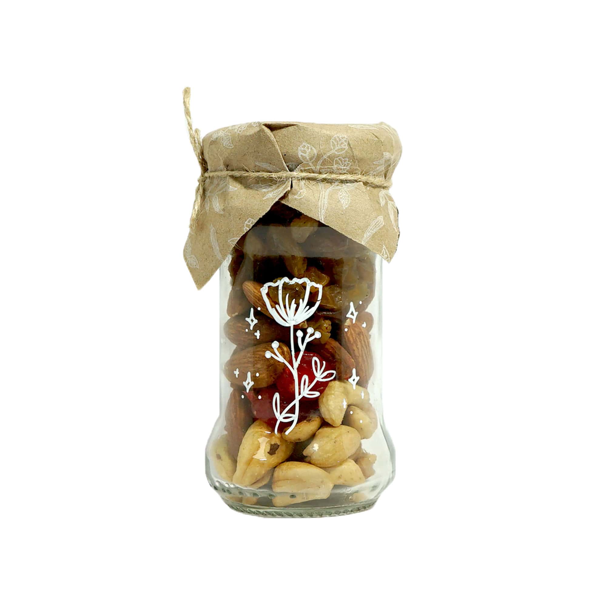 Combinación equilibrada de caju tostado, cereza deshidratada, almendra tostada y pasas rubias, presentados en un frasco de vidrio reutilizable. Una mezcla práctica y sabrosa que reúne frutos secos y deshidratados en formato compacto ideal para llevar o compartir.