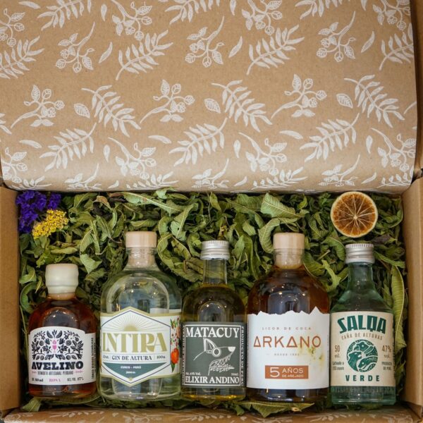 Cinco botellines, cinco expresiones del talento destilador peruano. Este pack presenta una cuidada selección de licores artesanales en versión mini, dispuestos sobre una cama de hojas secas de menta y cedrón que aportan un aroma fresco y natural. Una invitación a descubrir nuevos sabores en cada sorbo, perfecta para quienes valoran los detalles y la calidad.